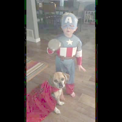 A tot boy is dressed up along with his dog. He shouts "Superheroes!" and puts down his makeshift shield which bonks his dog on the head.