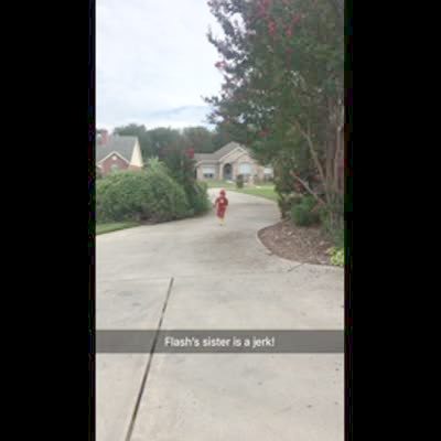 A boy in a Flash costume runs in the driveway and his sister off screen throws a ball and hits him in the head. Snapchat text: "Flash's sister is a jerk!"