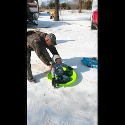 A man pushes a young boy down a hill on a sled and a woman jumps on a sled next to him to surf down the snow but quickly falls off her sled.