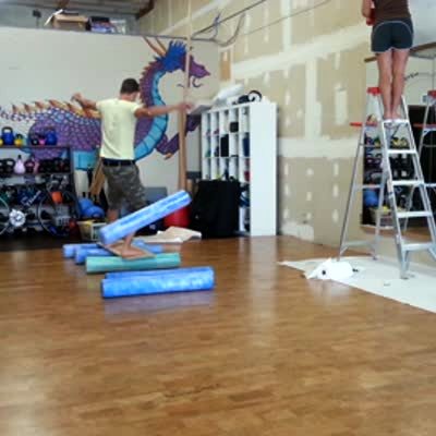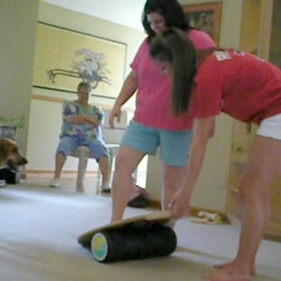 Woman stands on a piece of wood with a cylinder under it. She's trying to balance her weight evenly for core training. She loses balance and falls on her side.