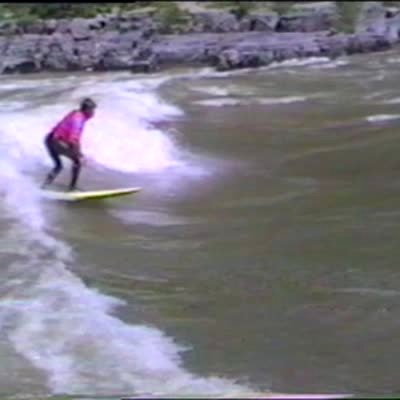 "Surf's Up... River" Surfing. Man surfs on river on endless wave.