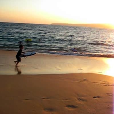 Bald man tries run and jump and boogie board on stomach on beach, face plants into the sand. Fall downs.