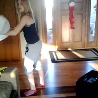 A teen girl stands on an ironing board then the board kicks out and she falls on her butt and hits her head against the wall.