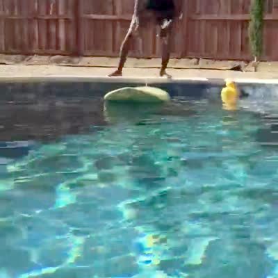 Two dogs with sunglasses on and a chicken ride on a surfboard across a pool in a yard.