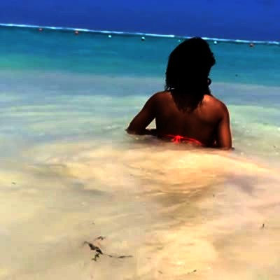 A woman dances outdoors at a beach in the surf, then falls over into the water.