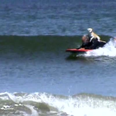 Brown dog rides on man's back surfing in the ocean. Beach, summer.