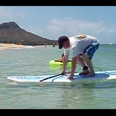 A woman holds onto her young daughter as she wake surfs. Her daughter holds onto her legs and surfs with her. Music rights not cleared.