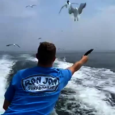 A man holds up a fish beside a boat. A flock of seagulls flies behind him, and one of the gulls gets the bird. Featured talent cleared only (man holding the fish).