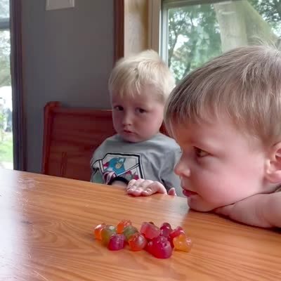 A man tells two tot boys at a dining table not to eat gummies until he gets back and one of the boys puts all of them in his mouth then spits them back out because he can't swallow them.