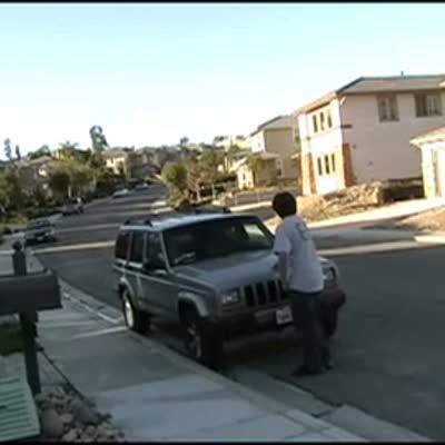 A man and woman film their teen son as he backs out of the driveway in their car. When he drives away he crashes into their mailbox and his mother curses.