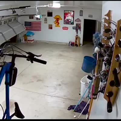 A rabbit runs past a man while he smokes a cigarette outside, and he screams loudly and jumps, then claims that a big-ass raccoon ran at him. His teen boy son comes out and asks if it was the rabbit, and the father says "no." Security footage.