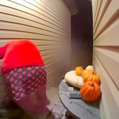 A teen girl talks through a doorbell camera on a porch, then a screen door swings open and hits her in the face. Security footage.