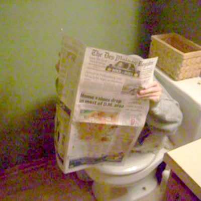 A boy holds a newspaper, crouched on a toilet with a dog in his sweatshirt, making it look like the dog is using the bathroom while reading. The woman behind the camera acts as though she's walked in on him.