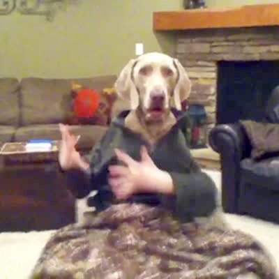 A dog's head is poking out of a sweatshirt. Hands move below it making it look like the dog's.