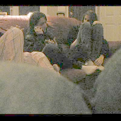 Pomeranian puppy dog wearing pink sweatshirt makes strange snorting noises in bedroom. Name that sound.