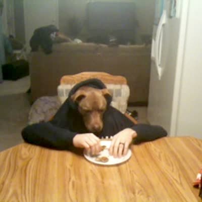 Schnauzer dog's heads sticks out of the top of a sweatshirt, human hands go through the sleeves and feed the dog food. Looks like a dog with human arms.