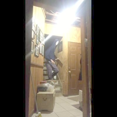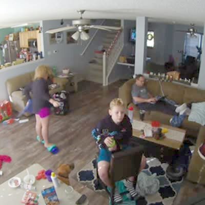 A man falls through the ceiling of the living room and lands on the floor. A man off-camera asks him if he is okay and the man says, "Yeah I'm fine. I'm just disappointed." Security footage. Featured talent cleared (no release for the man in the red sweatshirt)