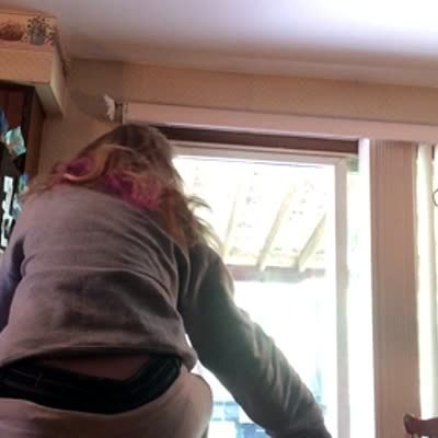 A teen girl sticks her legs through the sleeves of her sweatshirt and jumps around the living room and then slips and falls on her face.