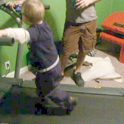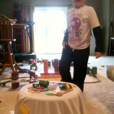A young boy tries to do the table cloth magic trick, but when he pulls it he throws all the food across the living room. He laughs and says "At least I swept the table clean."