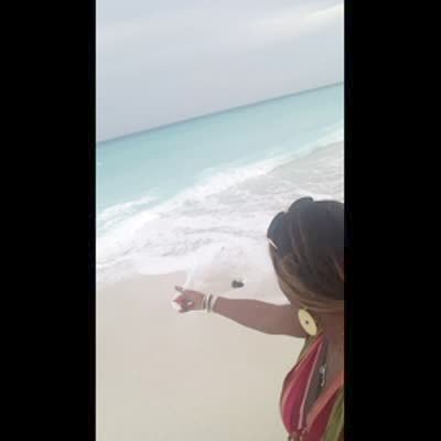A man and woman film themselves at the beach and her shoes get swept up in the ocean water.