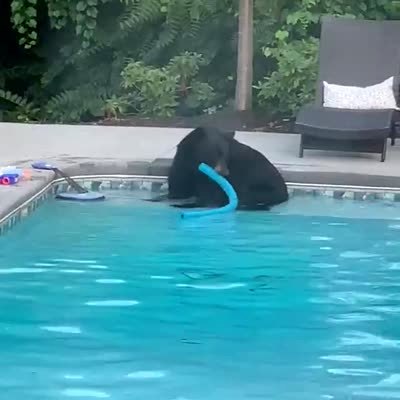 A bear sits inside of a swimming pool then takes a pool noodle out of the pool.