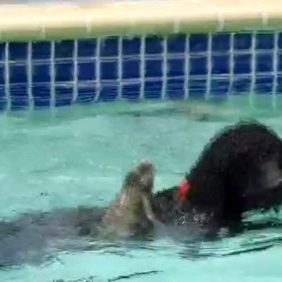 An Irish Water Spaniel dog swims in a pool with an iguana on his back, then the dog climbs out of the pool and the iguana jumps off of him.