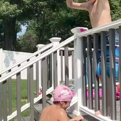 A young boy drops a swim cap full of water onto another young boy's head in the backyard. Slow motion.