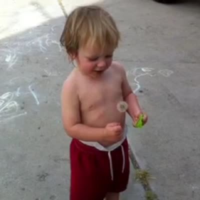 A tot boy in a swimsuit repeatedly tries to blow on a dandelion, gives up, eats it at :27, and spits it out.