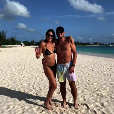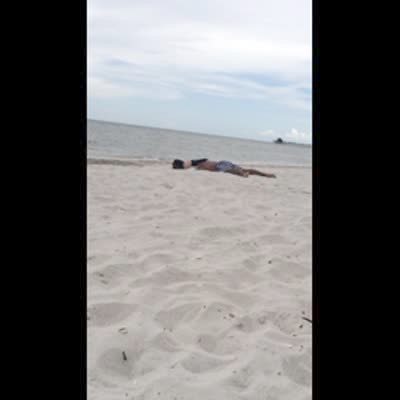 A man and woman pose for a photo on a beach when the woman says, "catch me" and quickly tries to jump in his arms but he fails to do so, and they both fall to the sand.