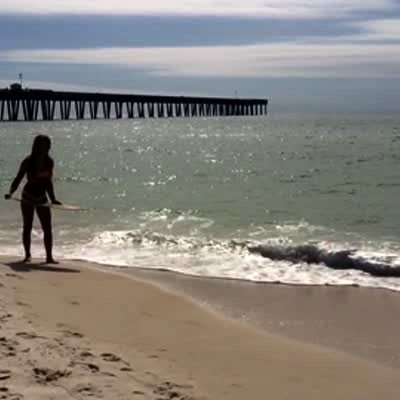 A woman paddle-boards for the first time and falls into the water while her family watches on. The man says "shit" when she falls. Featured talent cleared only (no releases for the people in the distance on the beach).