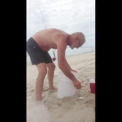 Bait fish repeatedly jump out of a bucket while a man in a swimsuit puts them back in on a beach.