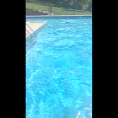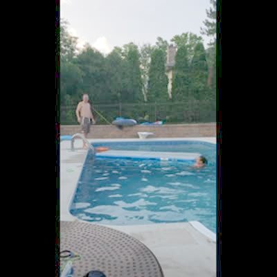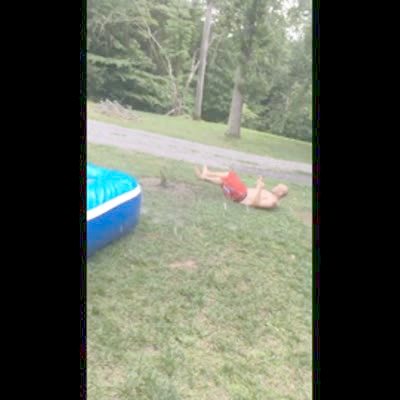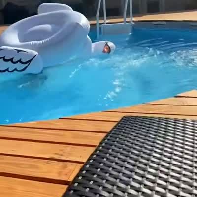 A man tries to walk on an inflatable float in a swimming pool and almost makes it, but falls on the side of the pool. Music rights not cleared.