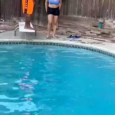 A teen girl in a bikini bounces on a diving board over a swimming pool outdoors, prepares to do a back flip, then slips and falls into the water.