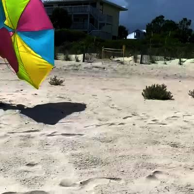 A woman tries to hold an umbrella in the sand, then it inverts and flies away on a beach.