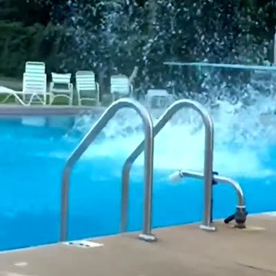 A man bounces on a diving board. Then he jumps in the swimming pool and the diving board breaks.