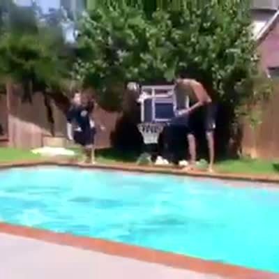 A group of boys work together to dunk a basketball in a swimming pool, synchronizing their jumps so they can pass the ball from one person to the next.