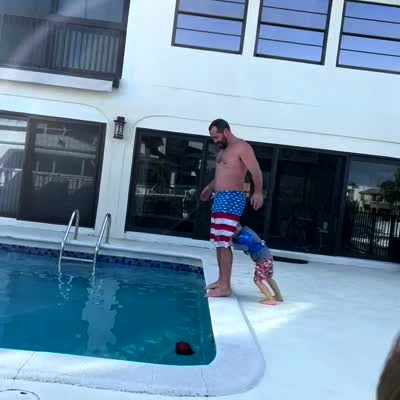 A young boy pushes a man into a swimming pool. As he pushes the man in, he flips into the pool as well.
