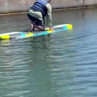 A man jumps from a boat onto a paddle board in a lake. He rides the paddle board out into the water, but the rope tied from the board to the boat gets pulled taut and he falls off the board.