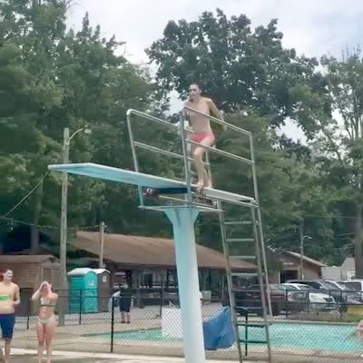 A man jumps on a high dive diving board, but slips on the edge and falls into the pool below in slow motion.