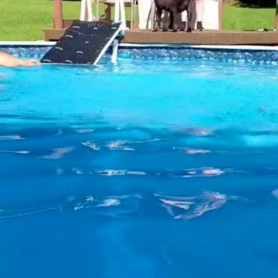A man swims in a pool and calls a dog into the water. The dog stands on the edge of the pool and barks at him. Eventually, it jumps into the pool and crashes into the man.