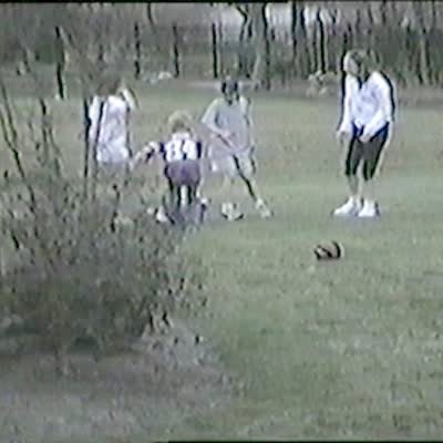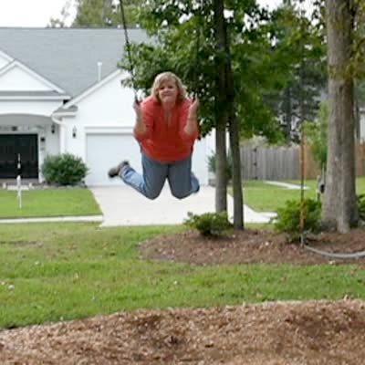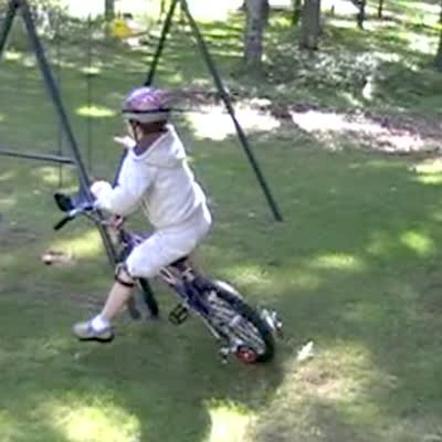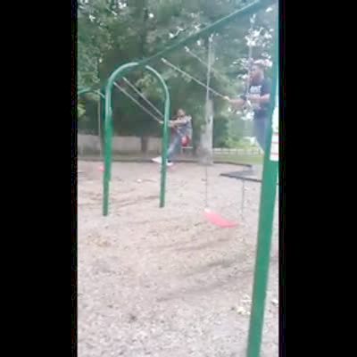 Two girls swing on backyard swingset, the whole thing falls apart and comes crashing down around them. With recovery. OC voice says "well I guess it's time to get rid of that"