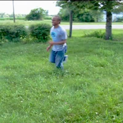 A teen boy swings on a playground swingset swing. He jumps onto a small toy plastic house, breaks the house, and falls hard on the ground. A young girl yells at him "You wrecked the house." Featured talent cleared (the boy who destroys the house).