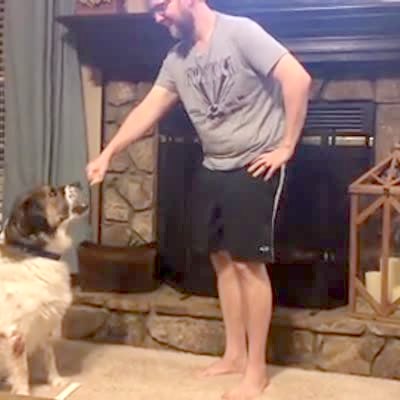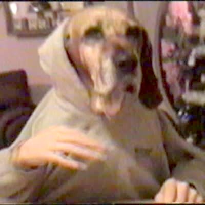 Dogs with human hands. About one minute in, the dog switches to a hound dog, which looks funnier. Person is putting glasses and a hat on the hound.