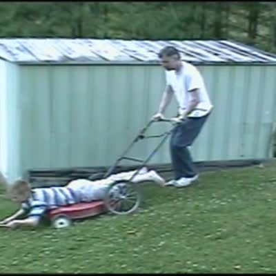 Boy lies on a lawn mower with clippers in his hands and cuts the grass as dad pushes him. They changes places.