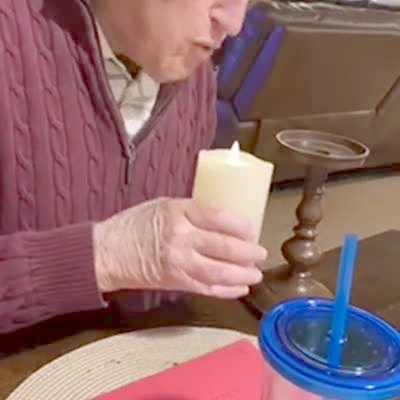 A senior man struggles to blow out a fake candle at a kitchen table. A woman switches off the candle and laughs.