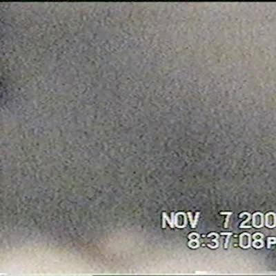 A man tries to open a door on the inside. A woman on the other side of the door falls in on the door. The door falls off its hinges and onto the man. Security Camera Footage.