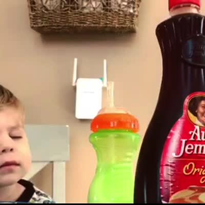 A tot boy closes his eyes and his dad swaps out an empty bottle of maple syrup for a full one and pretends that it is magic and tricks the tot boy.