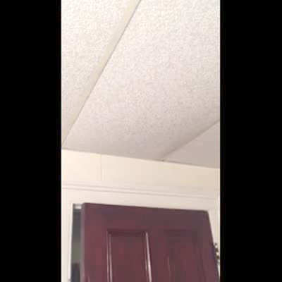 A cat walks around in the ceiling and then falls through it. The cat swings back and forth for a moment then falls and hits the light switch on his way down to the floor.