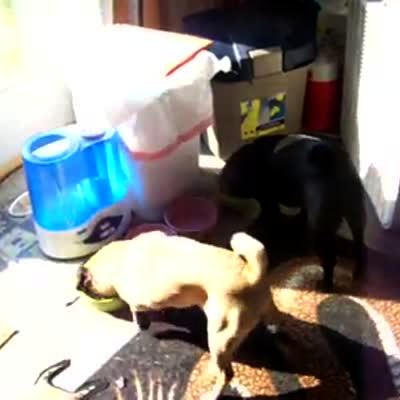 Small black dog & small brown dog eat food out of separate doggy bowls & repeatedly switch off.