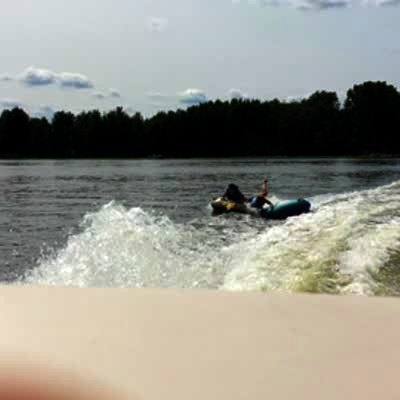 Two girls ride in tubes while they get pulled by a boat in a lake and one of the tubes crashes into the other tube. The girl on the tube that got hit falls off into the water and the girl on the other tube slides onto her tube, but then falls off as well.